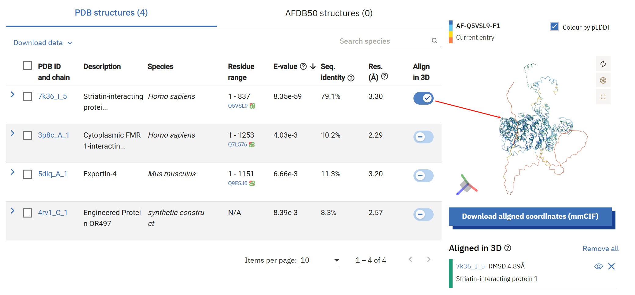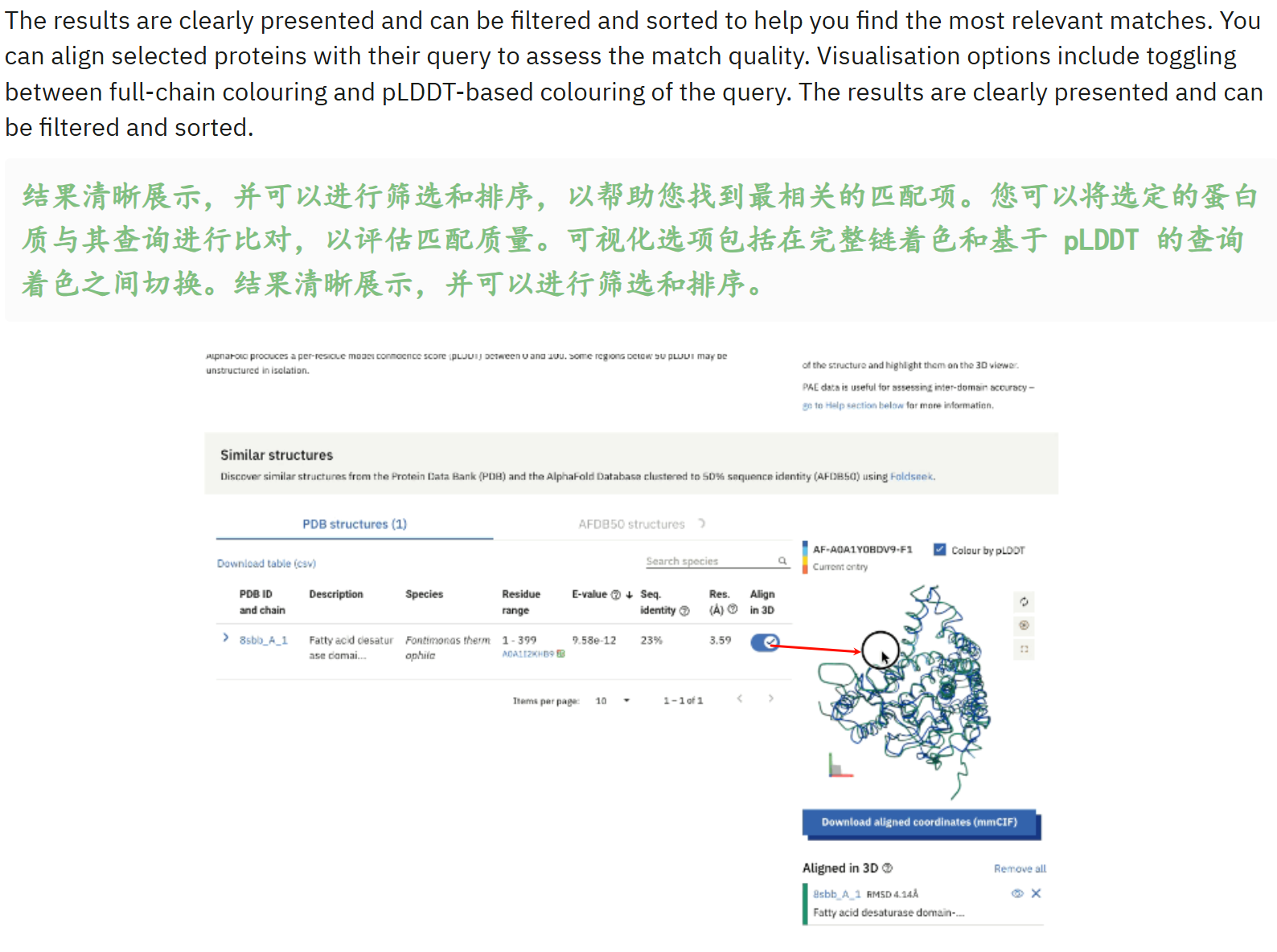 另外右边还有一个align in 3D,其实就是看实际的相似结构(PDB中的)和预测的结构(AFDB中的)对齐重叠效果如何,