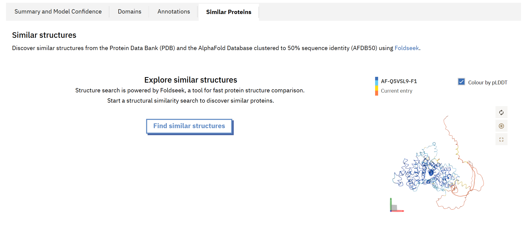 点击中间这个蓝色的方框,然后它其实是在PDB以及AFDB中寻找与当前结构相似的蛋白质: