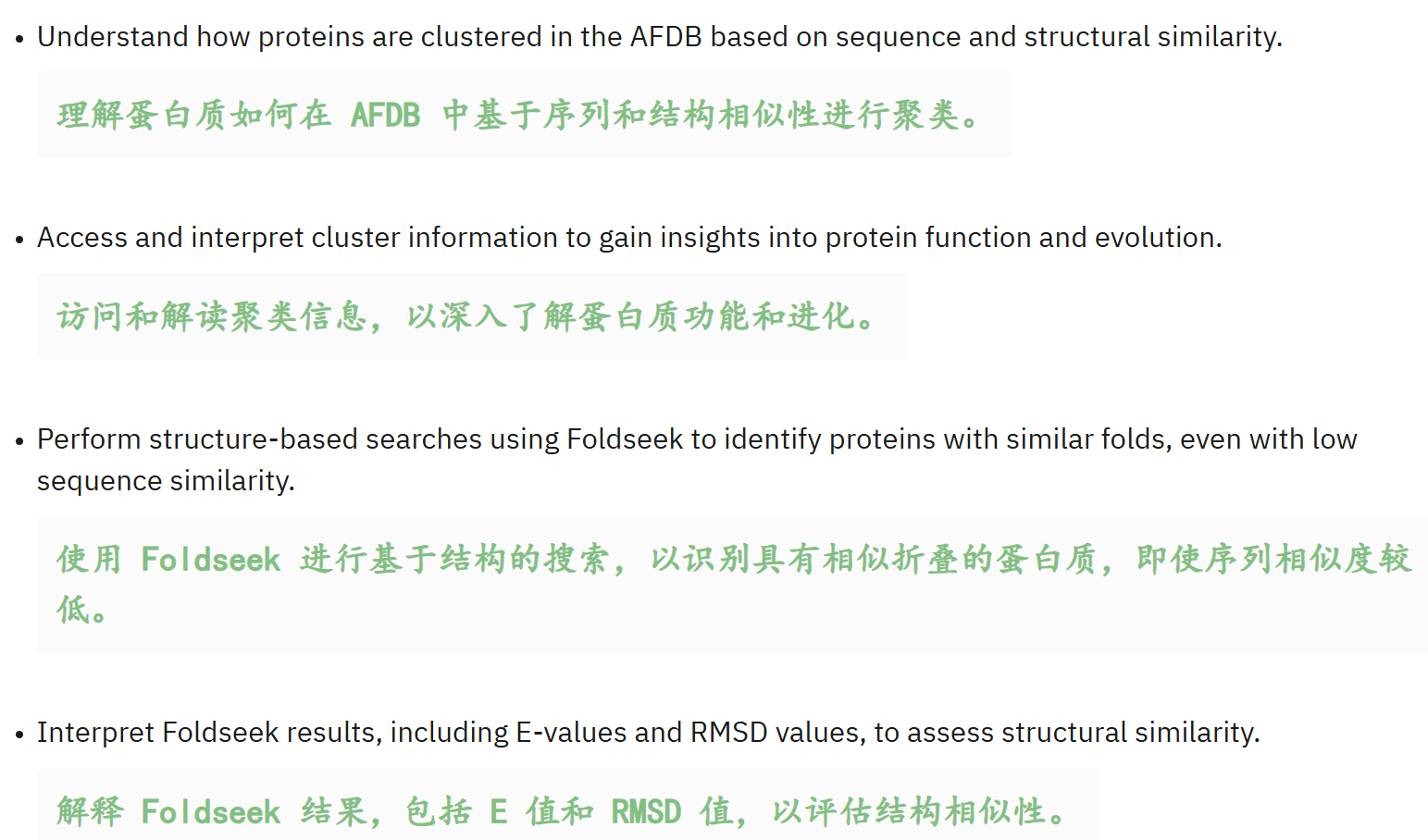 主要是聚类和Foldseek,目的是为了掌握以下目标: