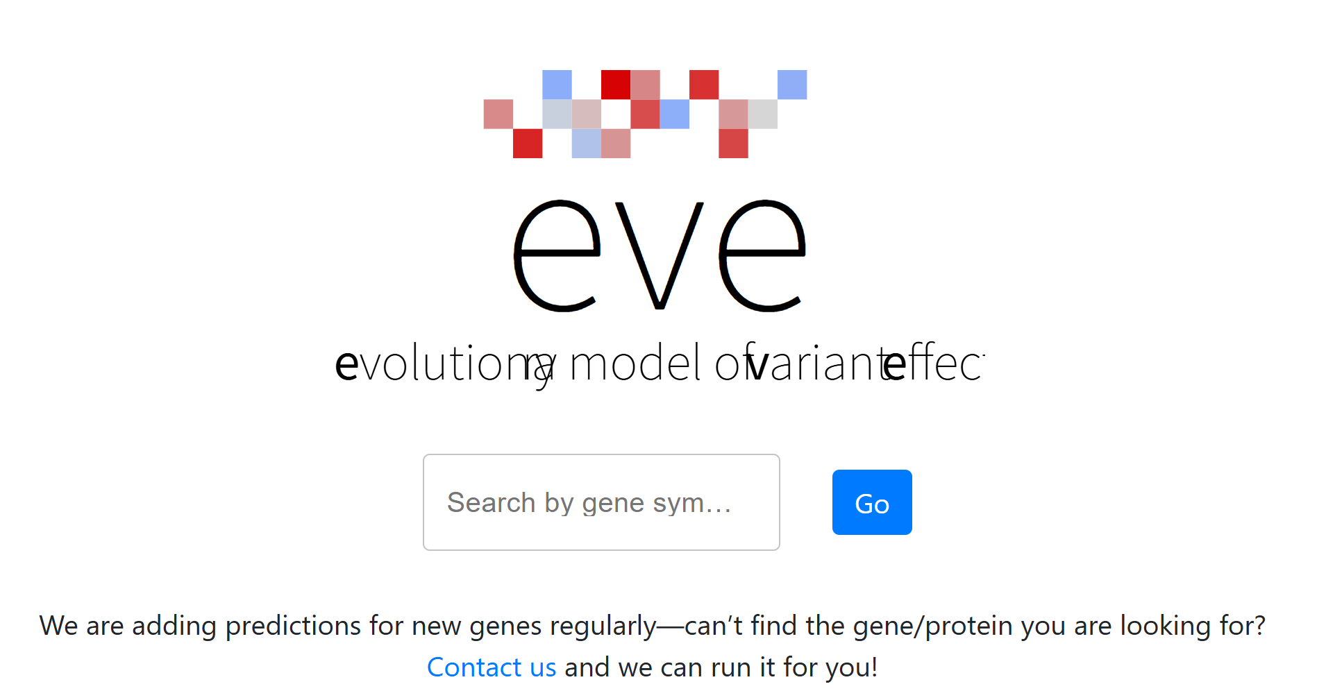 EVE:https://evemodel.org/,EVE 是一个基于跨物种进化序列预测人类变异临床重要性的模型。它使用在超过 140K 个物种的氨基酸序列上训练的完全无监督深度学习。我们对所有与疾病相关的基因的单个氨基酸变异进行预测,其形式为一个分数,范围从 1(最致病性)到 0(最良性)。