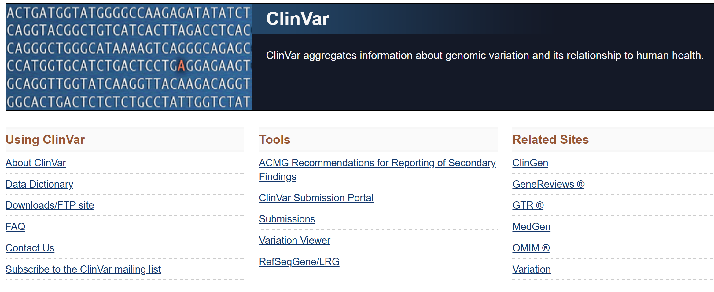ClinVar:https://www.ncbi.nlm.nih.gov/clinvar/,汇总了有关基因组变异及其与人类健康关系的信息