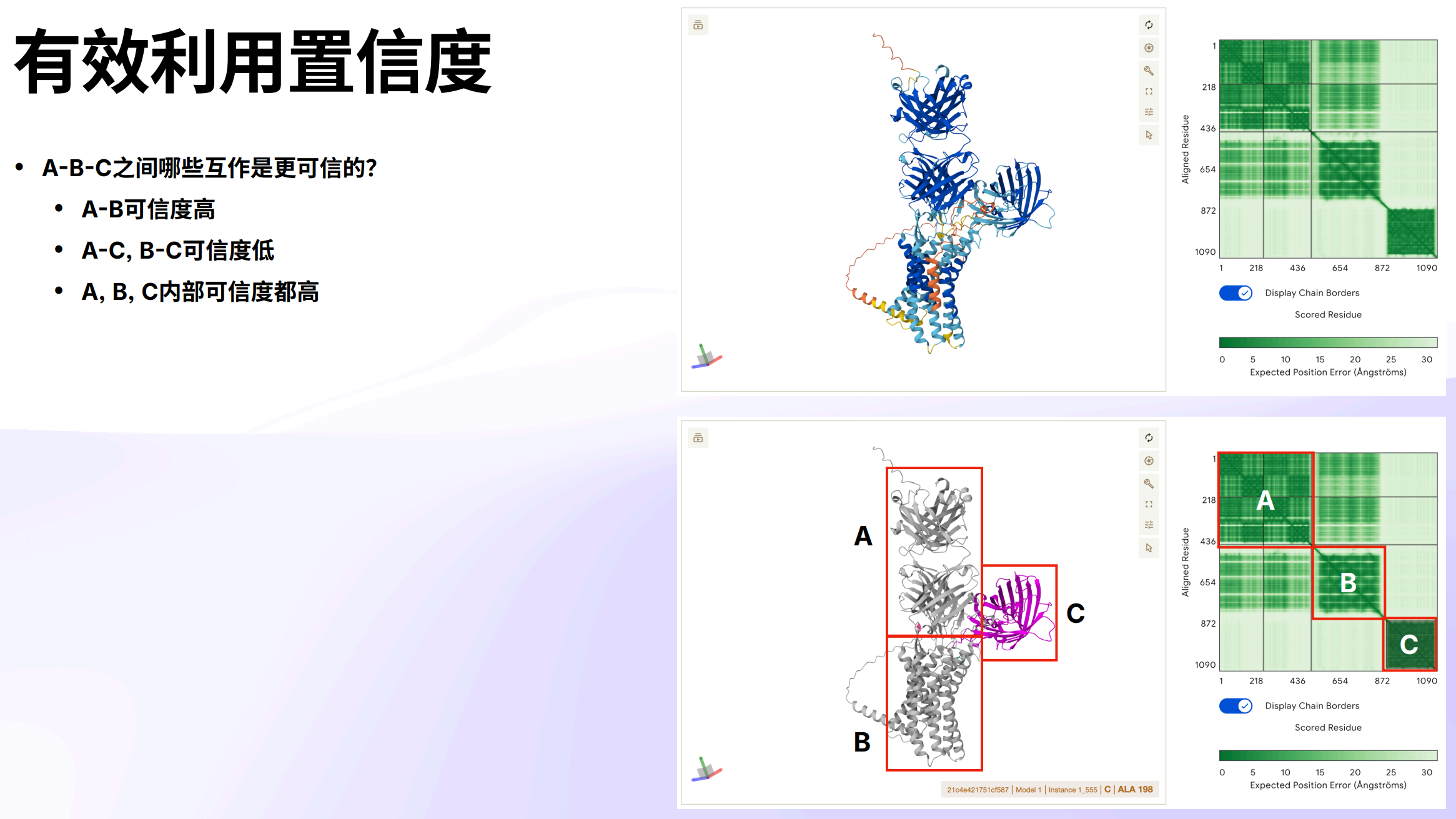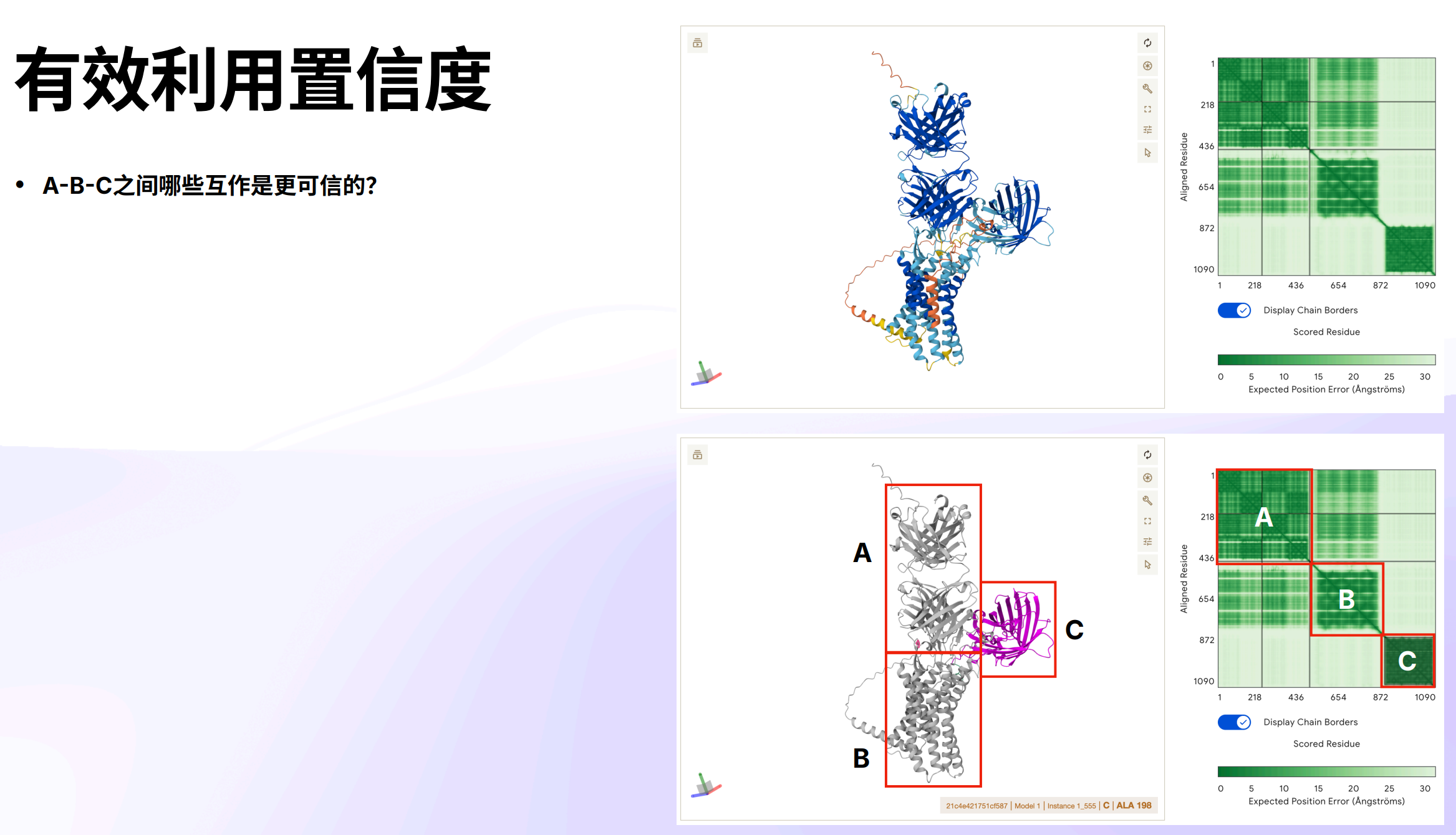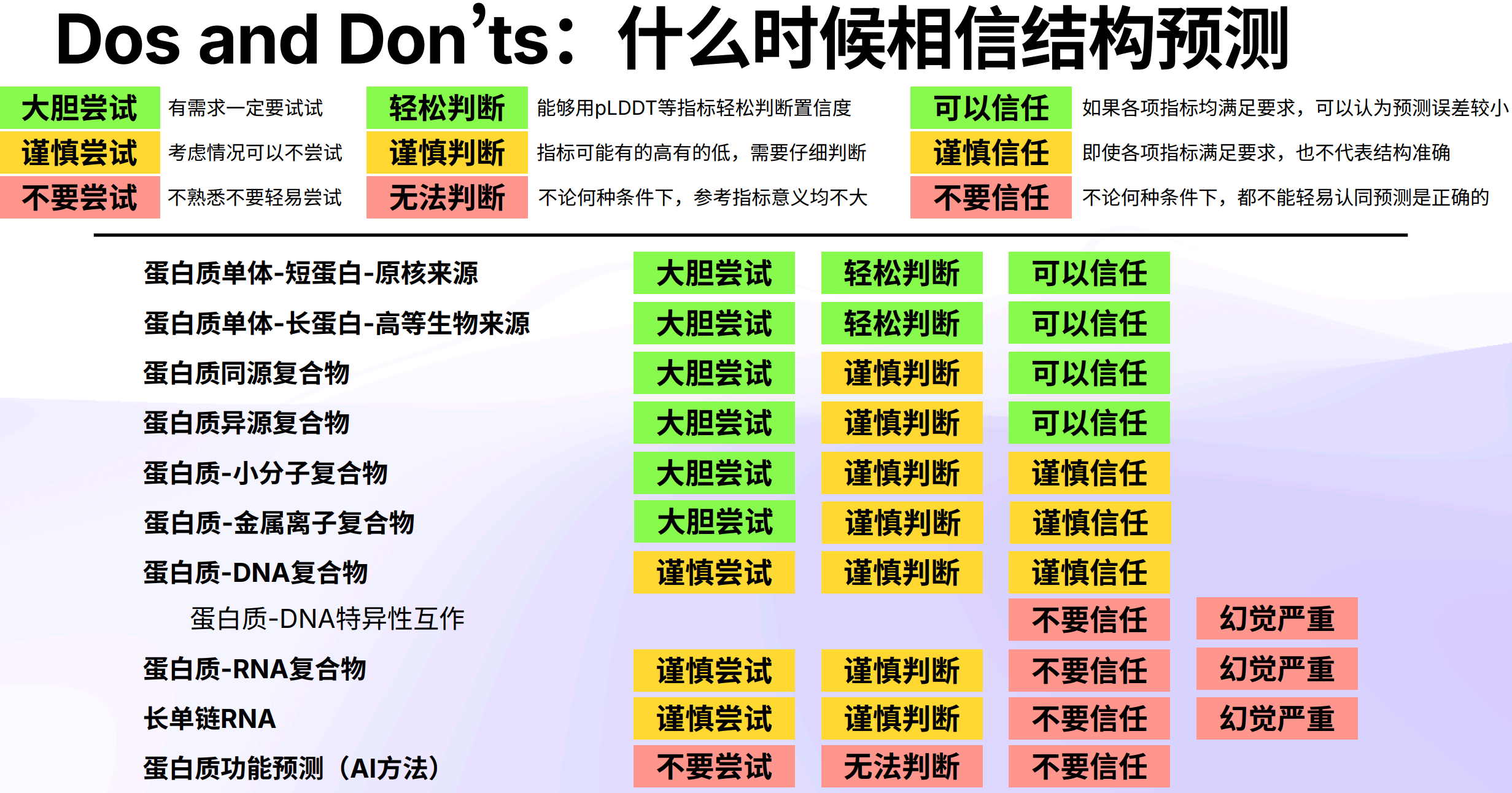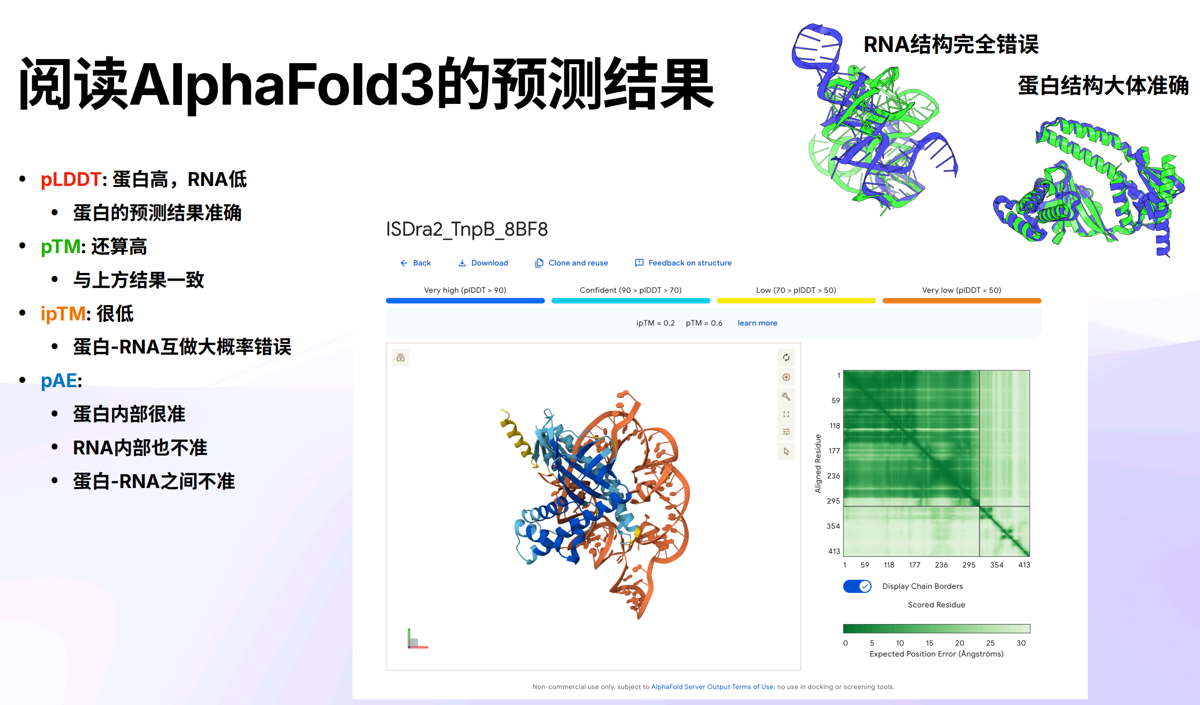 - 2,你hold住Alphafold3的预测结果吗?你的任务能够用它解决,或者非它不可吗,尽管实践/理论/试错表明你的任务用Alphafold3来建模,各种置信指标都很低,你能够从这些垃圾/无意义的东西中找到有意义的解读以及数据吗?