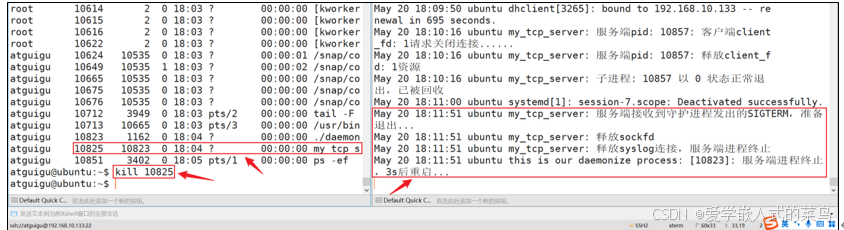 客户端运行 ctrl + d 断开与服务端的连接,使用 kill 杀掉服务端,3s后会重启