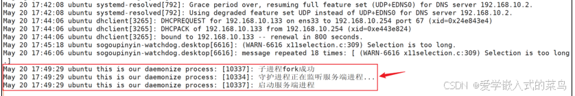 输入 tail -F /var/log/syslog 监控系统日志文件,运行程序可看到日志输出