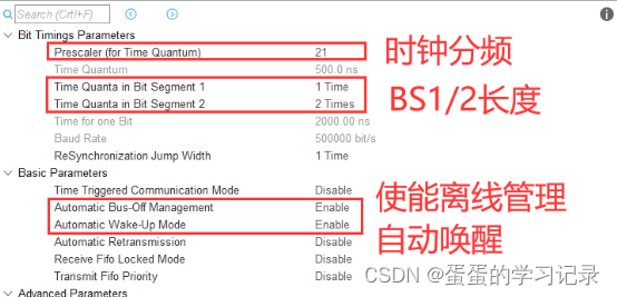 配置CAN相关参数,波特率设定为500K,时钟频率为42M,
