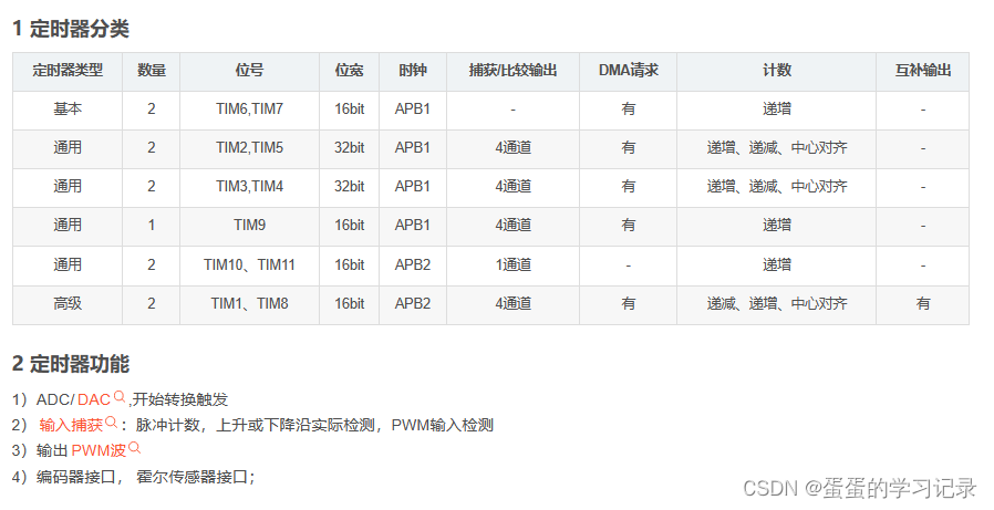 在第一部分时钟选择上,STM32定时器有四种时钟源选择(图中蓝色笔标识),分别是: