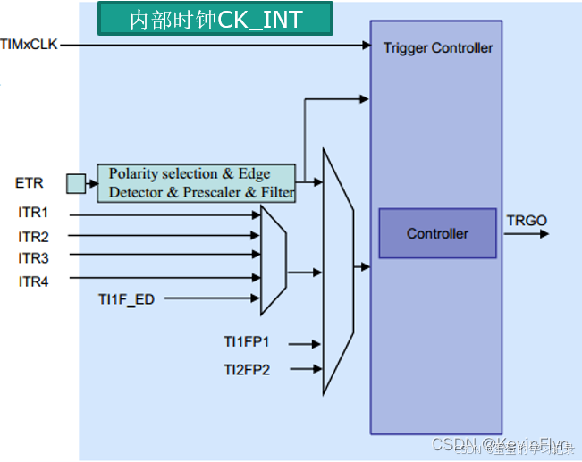 ③内部触发输入(ITRx):使用一个定时器作为另一个定时器的预分频器,如可以配置一个定时器Timer1而作为另一个定时器Timer2的预分频器。