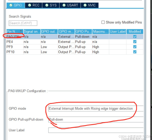 PA0经按键连接至3.3v电平,故设置为Pull-down。如连接至0v电平故设置为Pull-up。