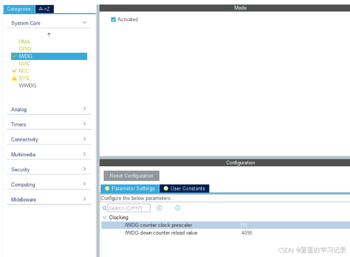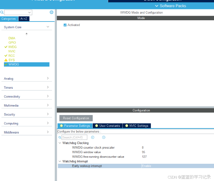 WWDG中只有上限是可以配置的,下限是固定的。固定以0X3F(63)处为下限,固定在0X40(64)处可开启EWI。
