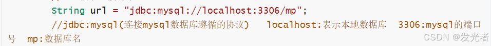 //jdbc:mysql(连接mysql数据库遵循的协议) localhost:表示本地数据库 3306:mysql的端口号 mp:数据库名