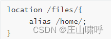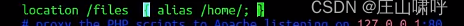 这个常见于Nginx做反向代理的情况,动态的部分被proxy_pass传递给后端端口,而静态文件需要Nginx来处理,假设静态文件储存在/home/目录下,而该目录在URL中的名字为files,那么就需要用alias设置目录的别名。
