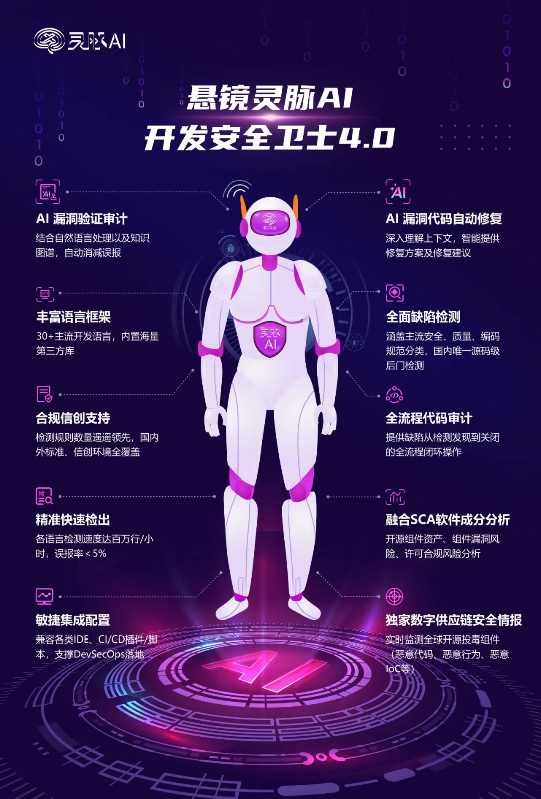 灵脉AI通过专利级原创软件程序分析算法并融合先进的 AI 大模型SAST技术,提供与代码安全专家能力相当、智能化AI开发安全智能体能力。国内率先实现一站式实现AI实时分析检测-AI智能审计验证-一键修复缺陷的智能体化闭环流程的AI安全智能体,不仅能够自动进行全面缺陷检测,还提供详细修复方案和建议,检测精度接近零误报、复杂检测场景进一步覆盖、检测效率更为强大,并依托悬镜供应链监测能力和AI安全大数据云端分析能力,实时动态监测风险情报,全面高效的帮助开发人员消除代码中漏洞风险,为软件信息安全保驾护航。