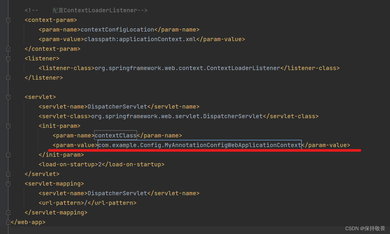 创建替代配置文件的核心配置类,在配置类中使用不同的注解来替代不同的组件标签,由此实现注解替代配置文件,但是,在Spring的配置文件web.xml中还要加载SpringMVC配置文件,但是此时该配置文件被创建的核心配置所替代,所以,我们应该创建应该类来加载核心配置类,在web.xml配置文件中加载创建的类,由此来达到加载SpringMVC核心配置类的目的。