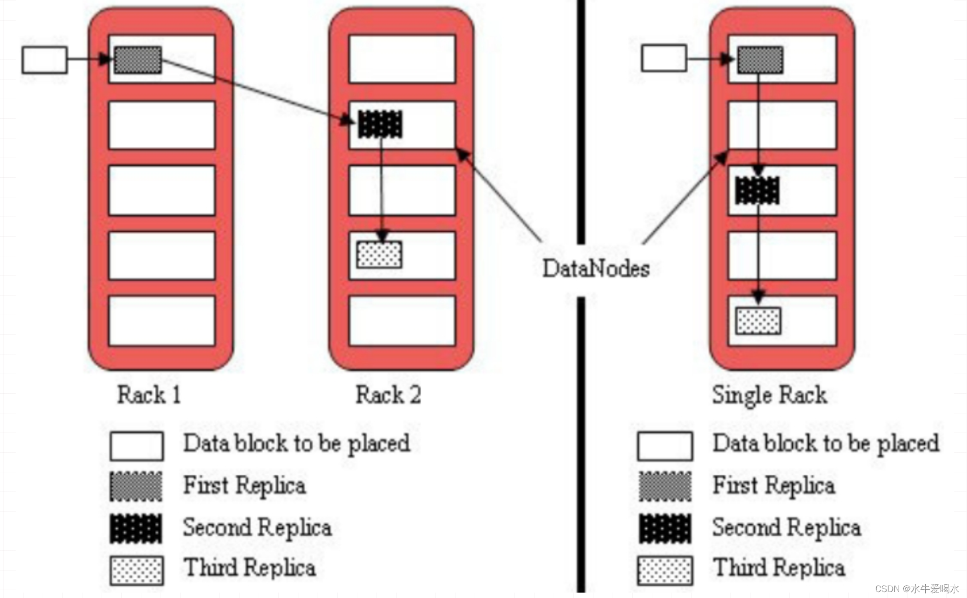 为了保证hdfs的数据的安全性,避免数据的丢失,hdfs对每个块数据进行备份,默认情况下块数据会存储3份,叫做3副本