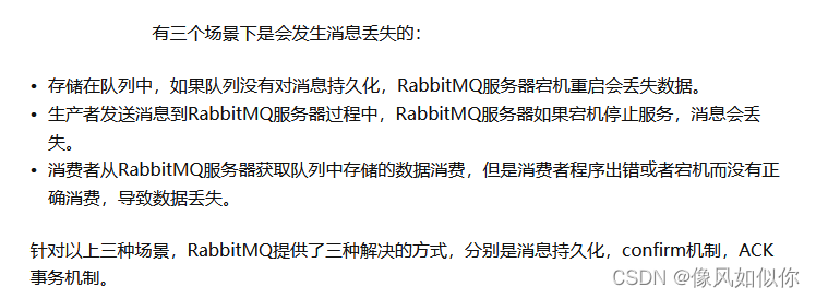 主要采用消息持久化来解决RabbitMQ消息队列的消息丢失,处理消息队列丢数据的情况,一般是开启持久化磁盘的配置,这个持久化配置和confirm机制配合使用,在消息持久化磁盘后,再给生产者发送一个Ack信号