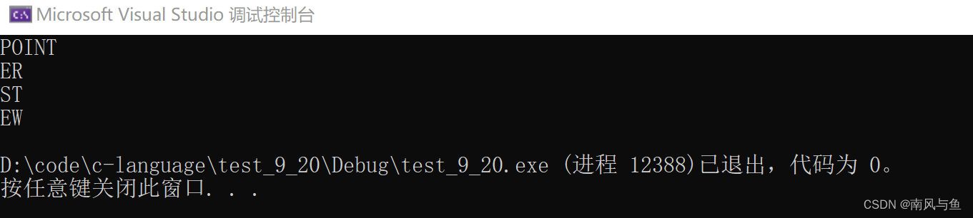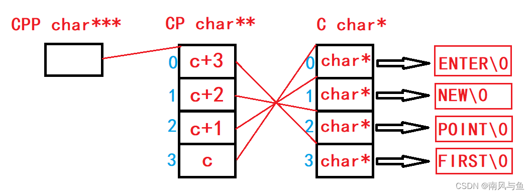 1.**++cpp,程序首先会执行++cpp操作,cpp会跳过一个char**的类型,此时就指向了c+2,对其解引用操作,我们拿到了c+2的这块空间里面的数据,即c+2,而c+2又是c数组下标为2的元素空间的地址,对其进行解引用操作,就拿到了c数组下标为2的空间,这块空间存放了‘P’的地址,%s就会根据P的地址向后打印字符串,打印的结果就是POINT