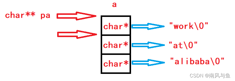 这里给出了一个名为a的指针数组,每个数组的类型是char*类型,实际存放的并不是"work","at","alibaba",而是字符串首元素的地址,第一个char*指向了'w'的地址,第二个char*指向了'a'的地址,第三个char*指向了'a'的地址;数组名a是数组首元素的地址,char*的地址为char**类型,存放到pa这个二级指针中,pa++就跳过了一个char*的类型,*pa就拿到了数组第二个元素,即'a'的地址,%s打印就为at