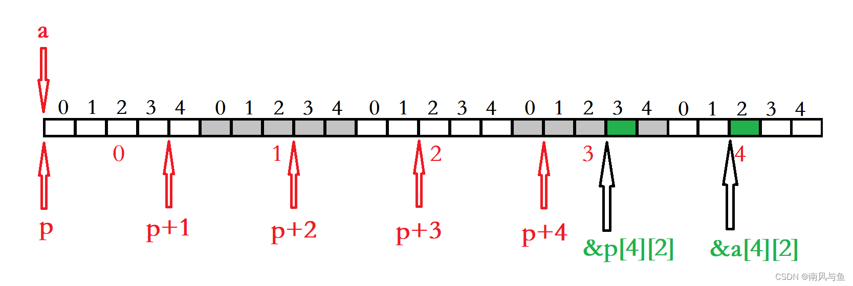 1.a为数组首元素的地址,即第一行的地址,它的类型是int (*) [5],p的类型是int (*) [4],虽然它们的类型不同,但并不影响将a的地址放在p里边去。