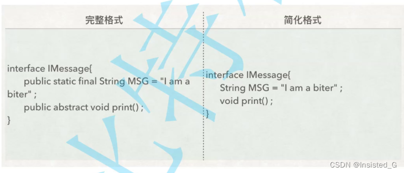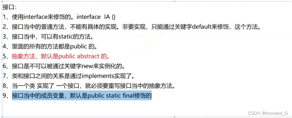 接口中全是默认的public抽象方法,不能有普通方法,但有两个例外。