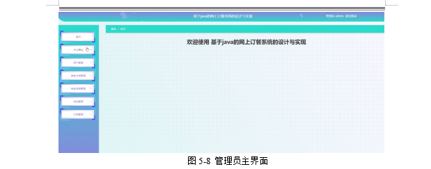 管理员进入主页面,主要包括对首页、个人中心、用户管理、美食分类管理、美食信息管理、系统管理、订单管理等进行操作。管理员主页面如图5-8所示: