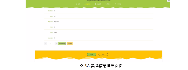 在美食信息页面的搜索栏输入菜品名称、美食分类、价格,进行查询,然后可以查看菜品名称、美食分类、封面、荤素、分量、单限、库存、价格、点击次数等信息,并且可以进行添加到购物车、立即购买、评论或收藏等操作,页面如图5-3所示: