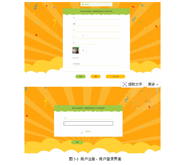 当用户进入系统前台进行相关操作前必须进行注册、登录,用户注册、用户登录界面如图5-1所示: