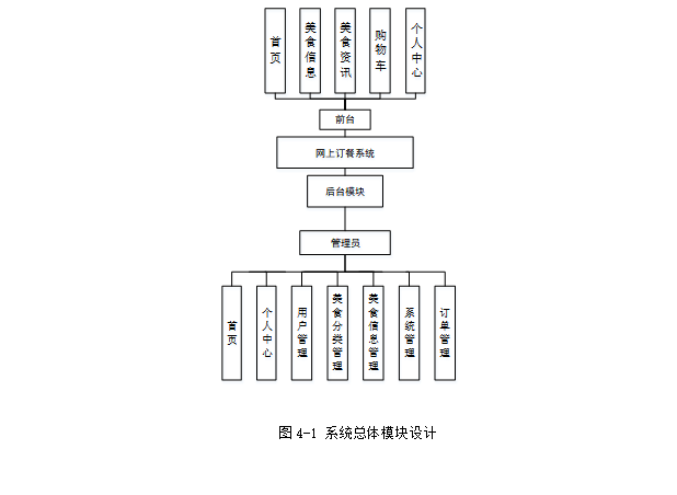 网上订餐系统按照权限的类型进行划分,分为用户和管理员两个模块。用户模块主要实现个人信息修改、对美食信息、美食资讯、购物车等信息进行操作,增强了用户的操作体验。管理员模块主要针对整个系统的管理进行设计,提高了管理的效率和标准。系统的总体模块设计如下图所示: