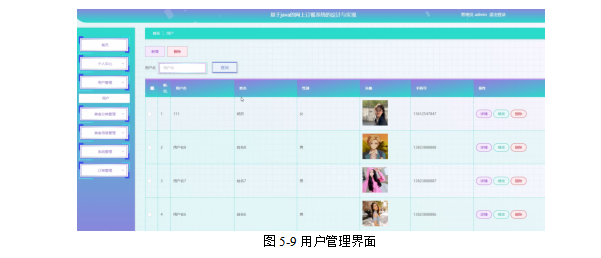 管理员点击用户管理,在用户管理页面的搜索栏输入用户名、姓名、性别、头像、手机号,然后进行查询、新增或删除用户信息等操作。如图5-9所示: