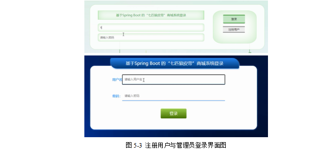 用户登录界面分为前台登录界面和后台登录界面,这里主要是是考虑到数据的安全性所做的一般性的设计。为了保证系统的安全性,系统前后台用户登录的页面不同,管理员和注册用户具体的登录界面如下图所示,需要输入正确的用户名和密码,点击登录即可,通过HTTP协议,将数据传递到后台。后台会查验数据库中的是否有该用户信息,有的话,登录成功,进行页面跳转,并通过浏览器的内置session对象类生保存生成的token字符串的值。这里说明一下,使用token是为了保证登录账户的安全性。