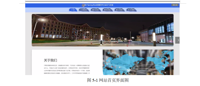 网站首页页面主要包括首页、课程信息、作业信息、积分商品、公告信息、后台管理等内容,并根据需要进行详细操作;如图5-1所示: