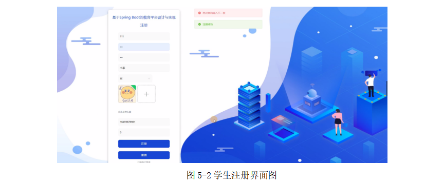 注册时将进行密码校验,若密码不一致将不能注册,以此来防止学生输入错误密码,影响体验,下面截图是学生注册成功页面,如图5-2所示。