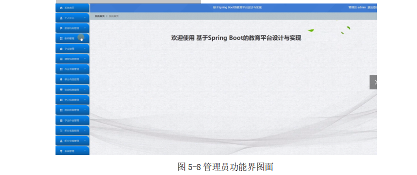 管理员登录系统后,可以对系统首页、个人中心、教育机构管理、教师管理、学生管理、课程信息管理、作业信息管理、积分商品管理、咨询信息管理、学习信息管理、签到信息管理、学生作业管理、积分奖励管理、积分兑换管理、系统管理等进行相应的操作管理,如图5-8所示。