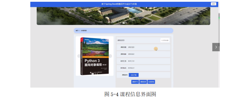 学生点击课程信息,在课程信息页面的搜索栏输入课程名称、课程范围,可以查询,也可以查看课程名称、课程图片、课程范围、课程视频、课程资料、教师工号、教师姓名等内容,并进行点击下载、课程学习、课程签到、在线咨询或收藏等操作;如图5-4所示。