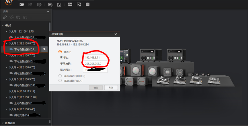 1、工控机网口ip全部设置好后,打开mvs软件,设置相机ip,前3位和网口相同,最后一位不同。例如网口2ip是192.168.8.70,那么可将相机ip改为192.168.8.71.