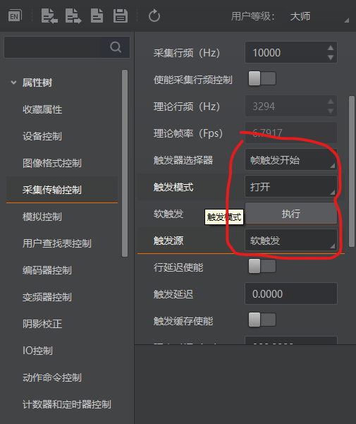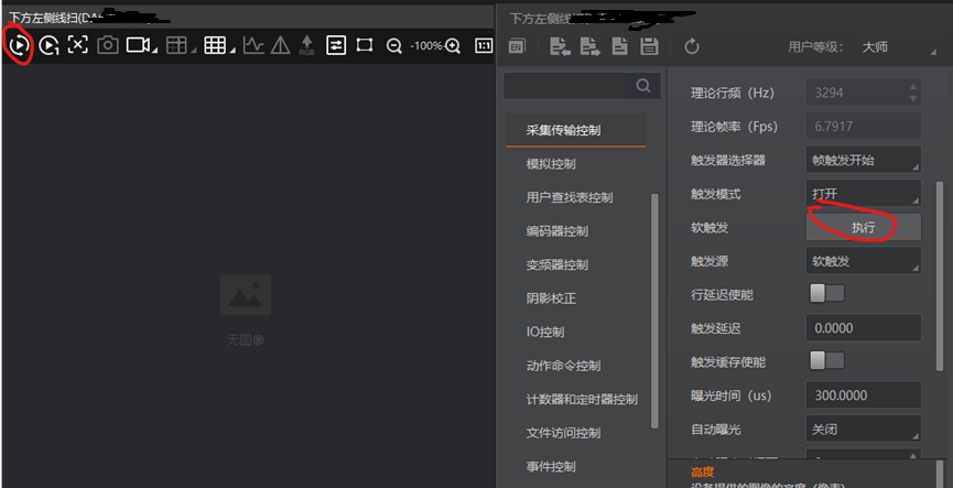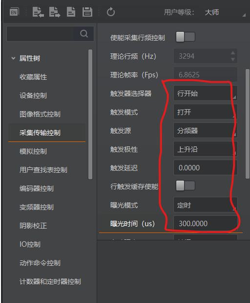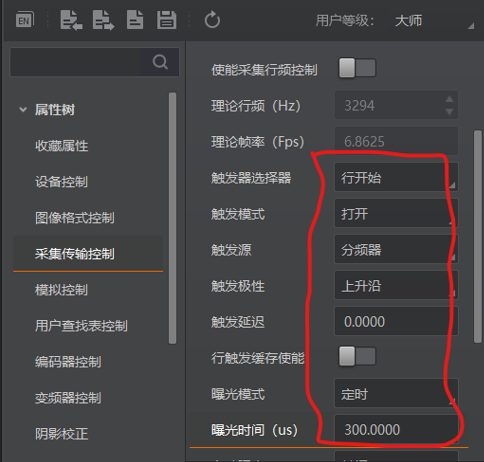 4、按下图改,曝光时间先设置位300ms,线扫相机曝光应调整至50-500区间。