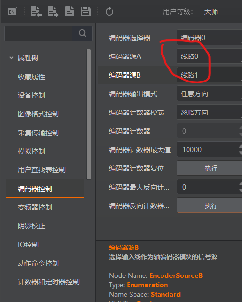 (1)如果你的相机只有一个轴移动,没有2个轴以上移动。在这里要和PLC电气工程师商量好,用什么线路触发,如果只有一个轴移动,建议商量设置为线路0和线路1。(电气工程师可以根据相机型号,搜索该相机的接线,决定触发源编码器的线路选择)