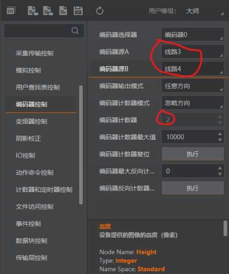 这里简单先介绍下线扫相机的编码器触发拍照原理,相机会根据接收到的脉冲信号来持续拍照。这里线扫相机触发源一般都是接线到伺服电机上,当伺服电机移动时会发出脉冲信号给线扫相机。当相机连接上伺服后,移动伺服,可以观察下图位置的编码计数器数值变化,代表接收到脉冲;