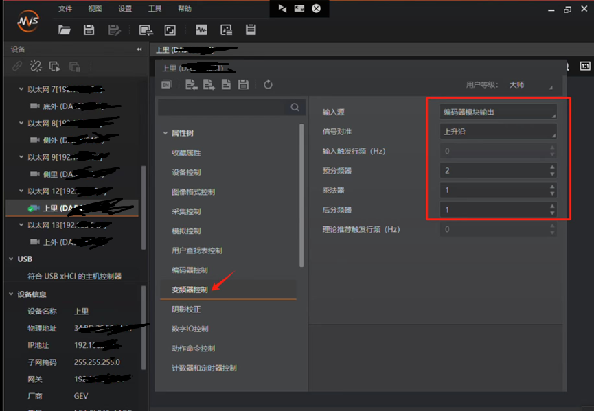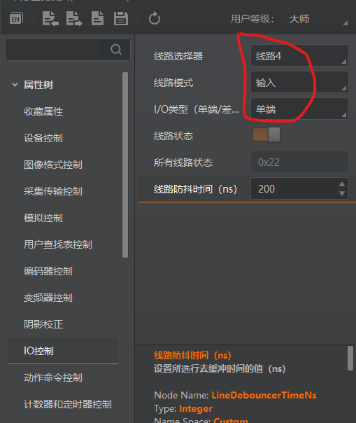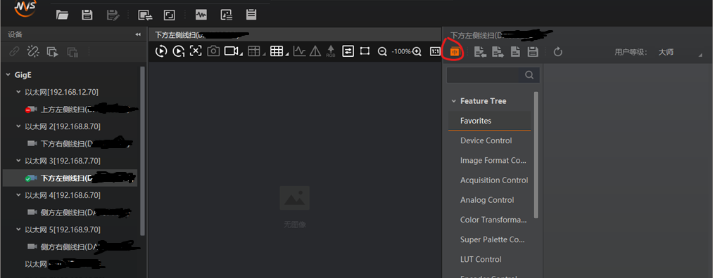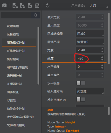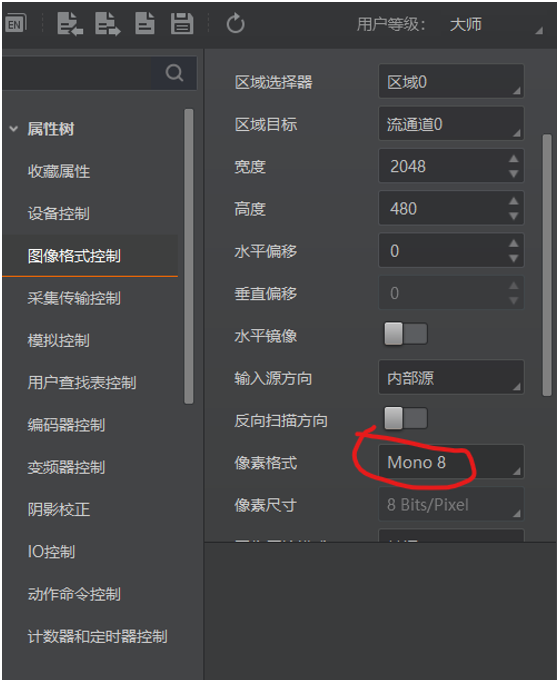 3、这部是将彩色改为黑白,将RGB8改为Mono8,右上角用户等级改为大师
