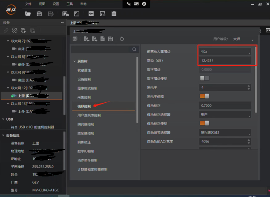 1、如果光圈进光量很大了,并且曝光很高了,还是发现成像很暗,可以调整前置放大增益(4K相机放大增益可以拉到4X,2K相机可以增加数字增益),另外需要把下方的伽马校正打开。