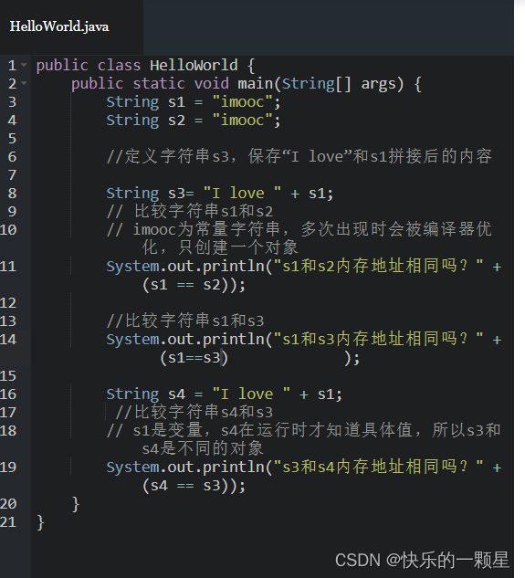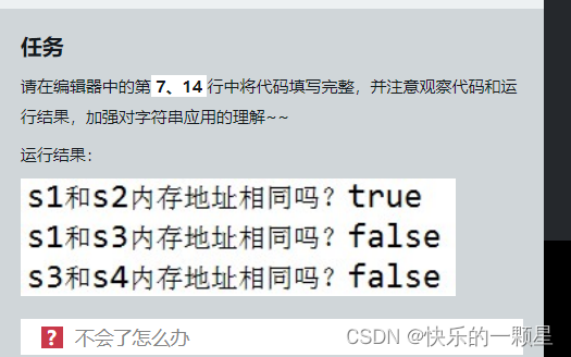 3、 每次 new 一个字符串就是产生一个新的对象,即便两个字符串的内容相同,使用 ”==” 比较时也为 ”false” ,如果只需比较内容是否相同,应使用 ”equals()” 方法(前面条件运算符章节讲过哦~~)