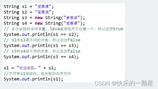 1、 通过 String s1="爱慕课"; 声明了一个字符串对象, s1 存放了到字符串对象的引用,在内存中的存放引用关系
