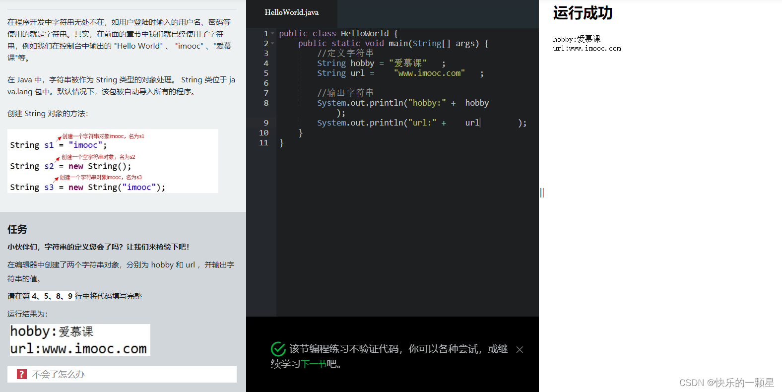 在程序开发中字符串无处不在,如用户登陆时输入的用户名、密码等使用的就是字符串。其实,在前面的章节中我们就已经使用了字符串,例如我们在控制台中输出的 "Hello World" 、 "imooc" 、"爱慕课"等。