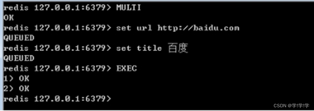 当输入MULTI命令后,服务器返回OK表示事务开始成功,然后依次输入需要在本次事务中执行的所有命令,每次输入一个命令服务器并不会马上执行,而是返回”QUEUED”,这表示命令已经被服务器接受并且暂时保存起来,最后输入EXEC命令后,本次事务中的所有命令才会被依次执行,可以看到最后服务器一次性返回了两个OK,这里返回的结果与发送的命令是按顺序一一对应的,这说明这次事务中的命令全都执行成功了。