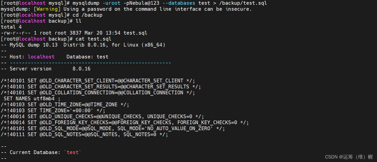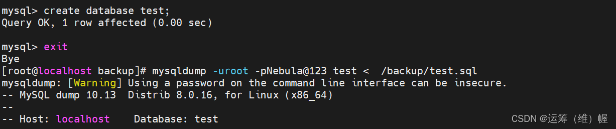 mysqldump -uroot -pNebula@123 --databases test > /backup/test.sql