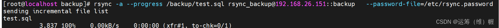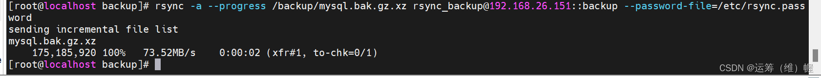 rsync -a --progress /backup/mysql.bak.gz.xz rsync_backup@192.168.26.151::backup --password-file=/etc/rsync.password