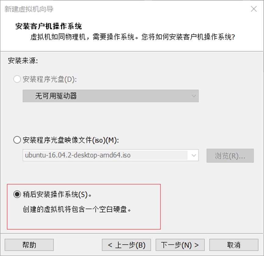 3、如下图所示,选择稍后安装操作系统,点击下一步