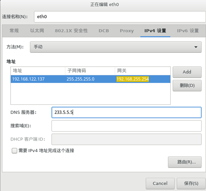 19、在IPV4设置中,选择手动,添加地址、子网掩码、网关、DNS服务器,点击