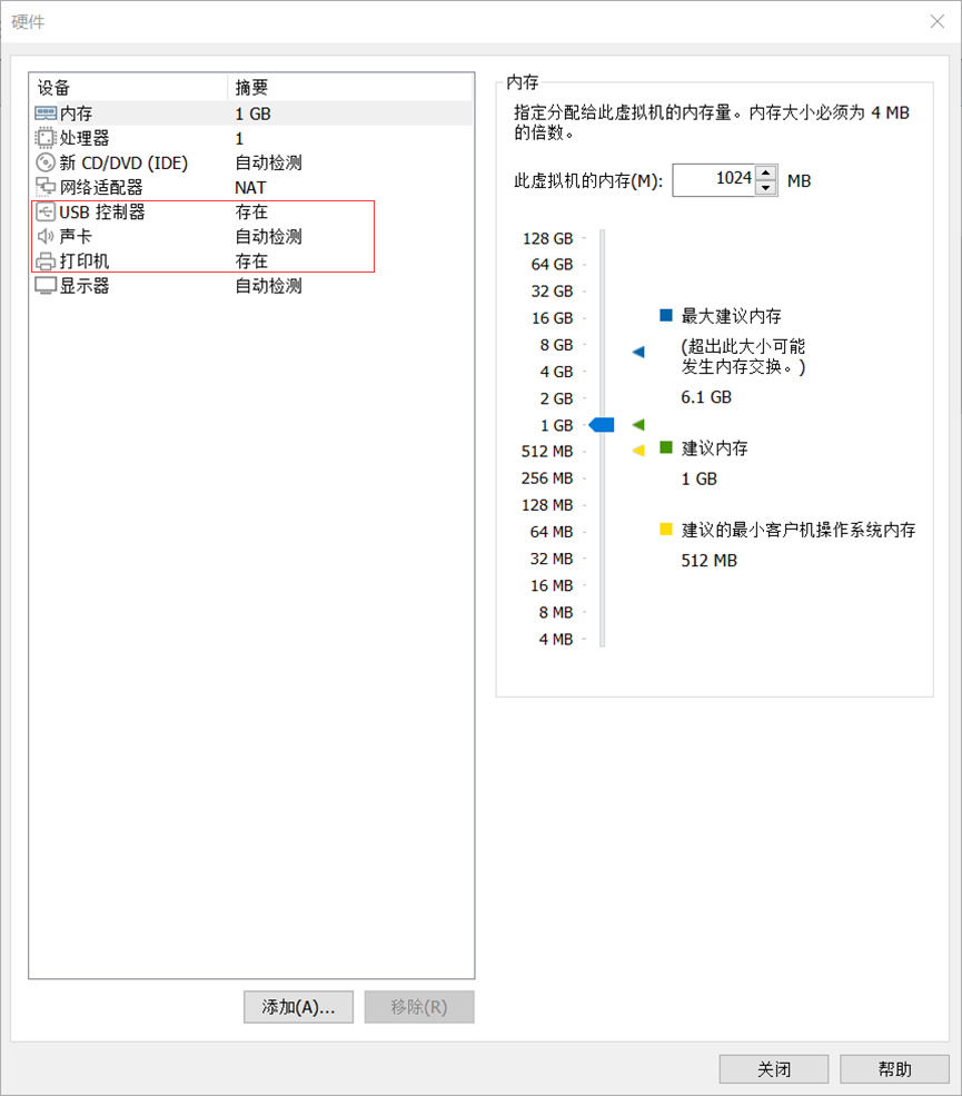8、如下图所示,其中,我们不需要USB控制器、声卡、控制器,将其选中->移除
