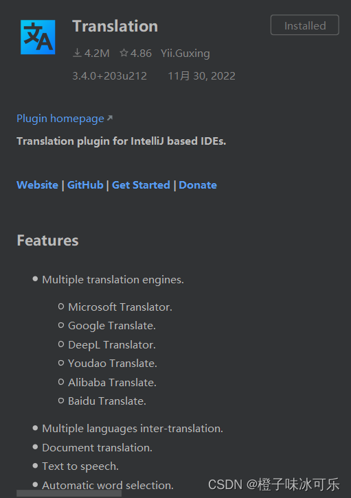 这是一款用于翻译的插件,可以进行中英互译。对于官方文档,如果你看不懂,想看哪里,就选中哪里,然后使用组合键Ctrl+Shift+Y 进行翻译。