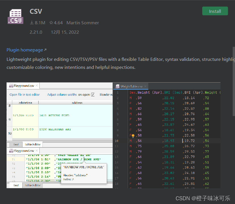 这个插件用于通过灵活的表编辑器编辑 csv、tsv、psv文件,语法验证,结构突出显示,可自定义的颜色,新意图和有用的检查。